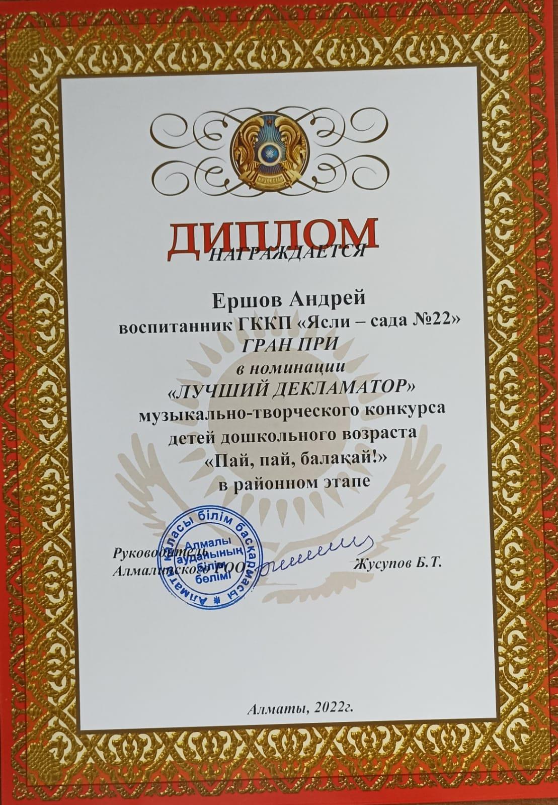 12 апрель 2022 0 1 2 3 4 5 "Пай,пай балақай!" Ершов Андрей воспитанник ГККП "Ясли - сада №22" ГРАН ПРИ в номинации "ЛУЧШИЙ ДЕКЛАМАТОР" музыкально - творческого конкурса детей дошкольного возраста "ПАЙ, ПАЙ БАЛАҚАЙ!" в районном этапе.