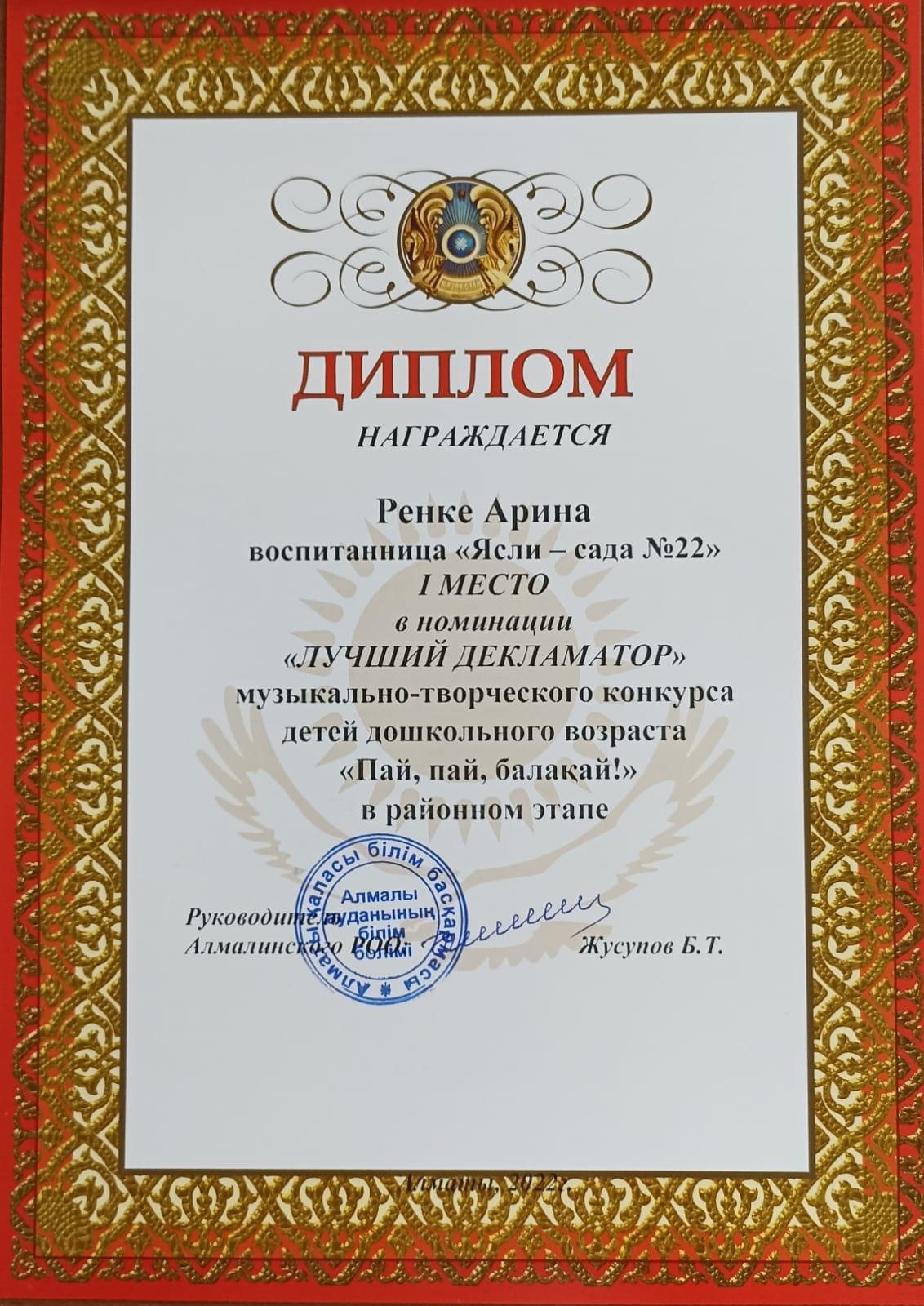 12 апрель 2022 0 1 2 3 4 5 "Пай,пай балақай!" Ренке Арина воспитанница ГККП "Ясли - сада №22" І место в номинации "ЛУЧШИЙ ДЕКЛАМАТОР" музыкально - творческого конкурса детей дошкольного возраста "ПАЙ, ПАЙ БАЛАҚАЙ!" в районном этапе.