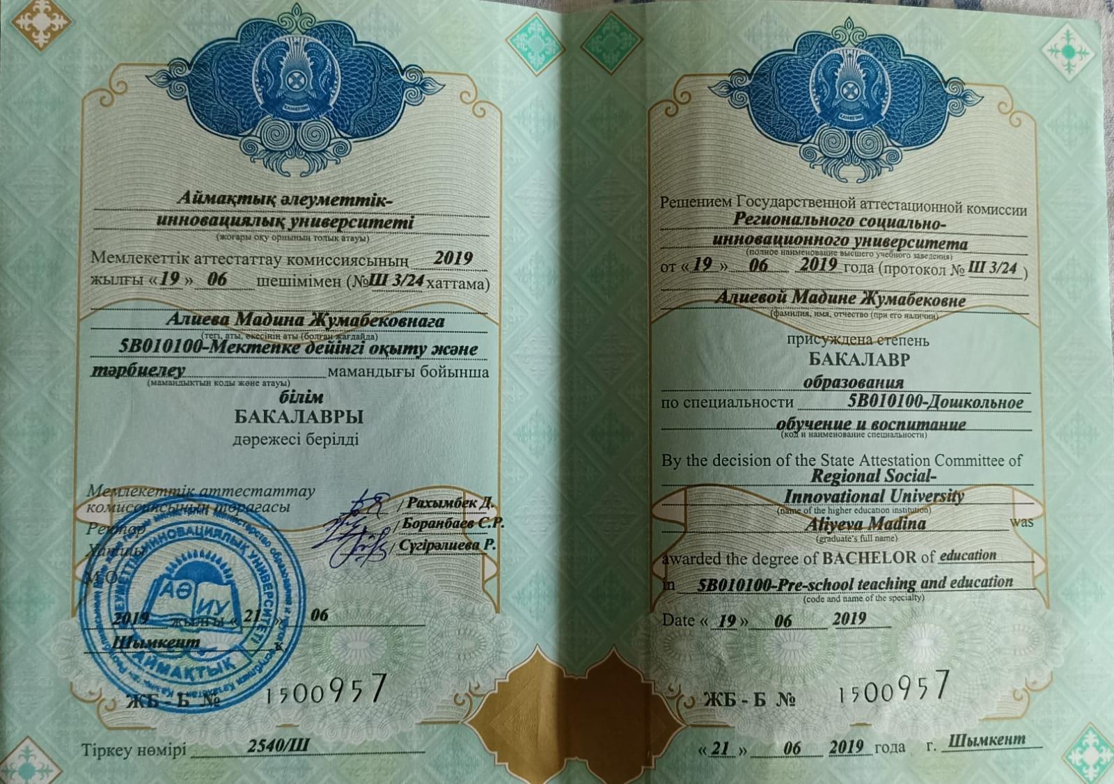 Образование; Высшее 2002г. Семипалатинский Государственный университет им Шакарима; казахский язык и литература; филолог, академическая степень бакалавр.